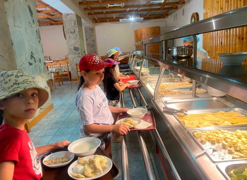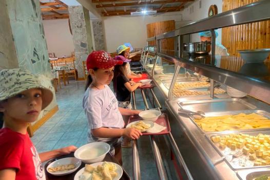 5-ти разовое в современной благоустроенной столовой. В рационе свежие овощи и фрукты, мясные и молочные кисломолочные продукты, натуральные соки и выпечка, обеспечение чистой питьевой водой. Предусмотрено специальное диетическое питание для детей, страдающих хроническими заболеваниями.