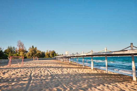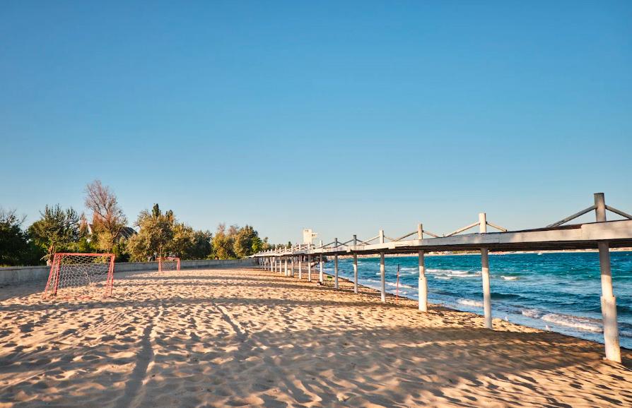 Собственный песчаный пляж лагеря Прометей в Евпатории находится в 50 метрах от спальных корпусов, огороженная буйками акватория для купания, оборудован теневыми навесами, кабинками для переодевания, туалетами, ногомойками, питьевой водой, пунктами спасательной и медицинской службы